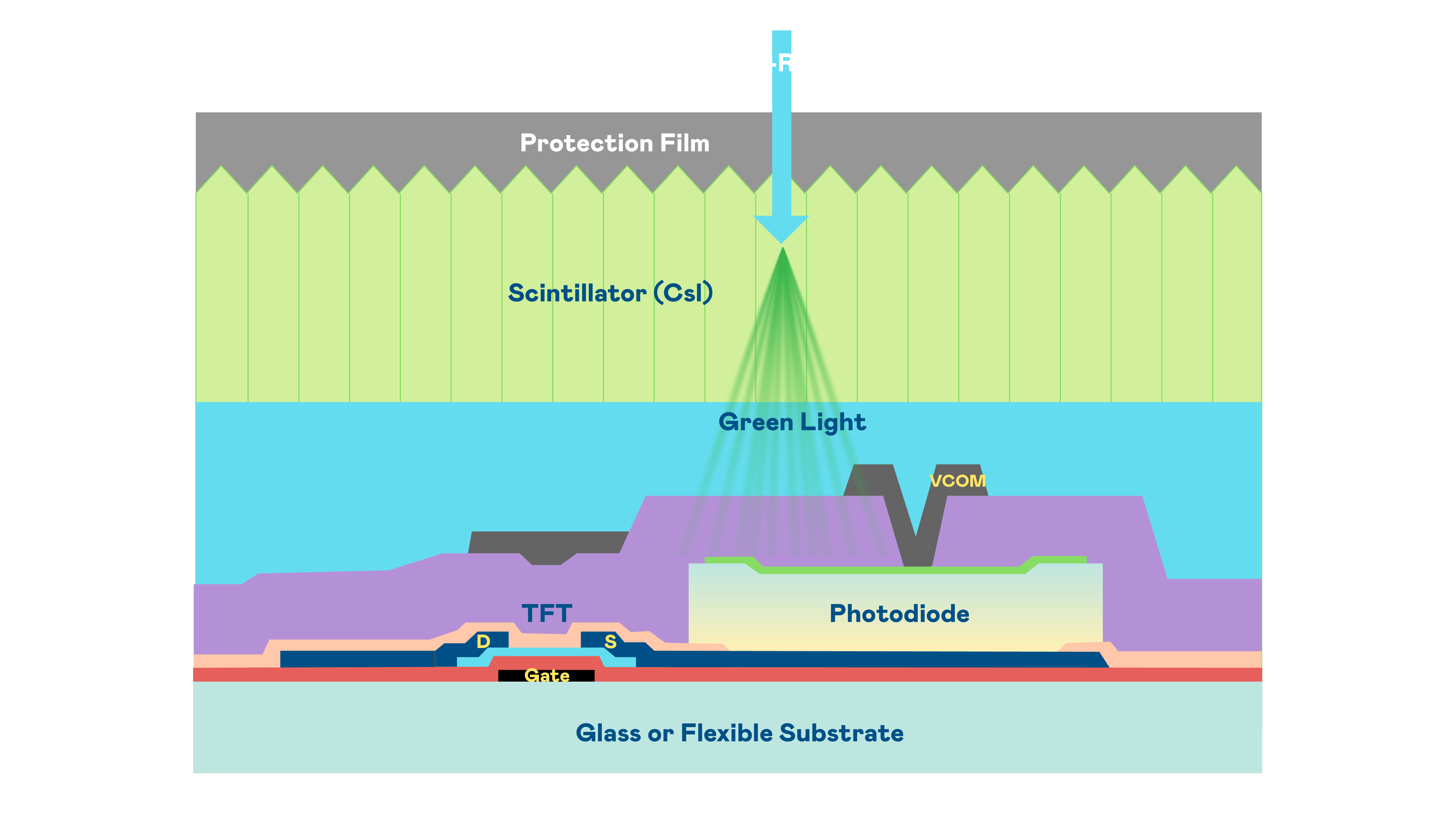 AG旗舰厅的X光影像感测阵列使用薄膜电晶体 (TFT) 作为每个像素的读取开关,搭配光电二极体(Photodiode)的光电转换元件,用以感测X光影像讯号。